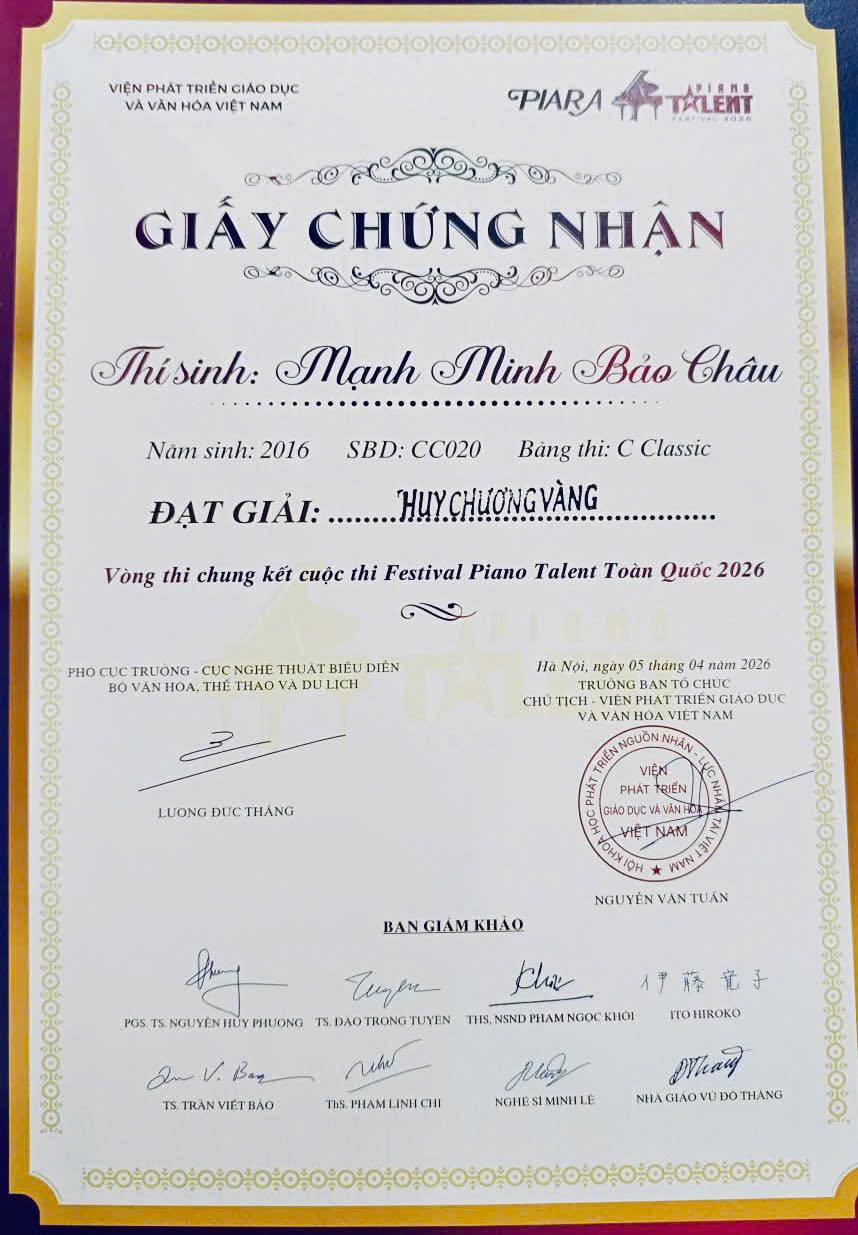 🌟 VINH DANH HỌC SINH ĐẠT GIẢI CUỘC THI FESTIVAL PIANO TALENT TOÀN QUỐC 2026 🌟 By quantrivien Views: 5 - Category: Tin tức - On: 07/04/2026 Trường Tiểu học Đại Mỗ 3 xin chúc mừng em Mạnh Minh Bảo Châu – học sinh lớp 4A5 đã xuất sắc đạt Huy chương Vàng tại Vòng Chung kết Cuộc thi Festival Piano Talent Toàn quốc 2026. Đây là thành quả xứng đáng cho niềm đam mê âm nhạc, sự kiên trì luyện tập và tinh thần nỗ lực không ngừng của em trong suốt thời gian qua. Thành tích đáng tự hào này không chỉ ghi dấu ấn cá nhân mà còn góp phần lan tỏa niềm yêu nghệ thuật trong học sinh toàn trường. Nhà trường trân trọng ghi nhận và biểu dương thành tích của em đồng thời gửi lời cảm ơn tới gia đình và thầy cô đã luôn đồng hành, động viên để em phát huy năng khiếu và tỏa sáng trên sân khấu lớn. Chúc em Mạnh Minh Bảo Châu sẽ tiếp tục nuôi dưỡng đam mê, gặt hái thêm nhiều thành công rực rỡ hơn nữa trong hành trình âm nhạc phía trước.